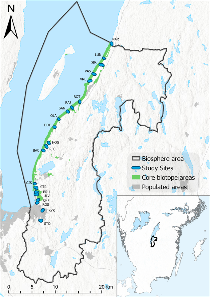 - 21 Sites across the East Vättern scarp landscape were chosen based on a few common factors, such as presence of permanent water flow and deciduous hardwood forests.